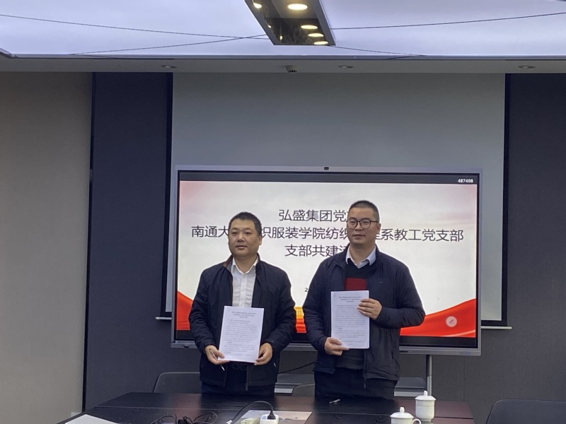 江苏弘盛新材料(集团)股份有限公司总经理、党支部书记徐继军详细介绍了企业生产经营现状、核心产品优势及党支部建设成效,并重点分享了党建与生产经营深度融合的实践经验。纺织工程系教工党支部书记潘刚伟介绍了bbin宝盈集团的发展历程、学科特色及纺织工程系教工党支部的人员构成、党建工作亮点,并回顾了学院与江苏弘盛新材料(集团)股份有限公司长期以来的合作渊源,对双方现有合作项目的进展与成果给予高度评价。潘刚伟表示,将以此次党建共建为契机,进一步夯实合作基础,推动双方在科研攻关、成果转化、人才培养与党建共建等领域实现更深层次、更广范围的协同发展。潘刚伟与徐继军代表双方党支部正式签署党建共建协议,为校地校企资源共享、优势互补搭建了坚实平台。
